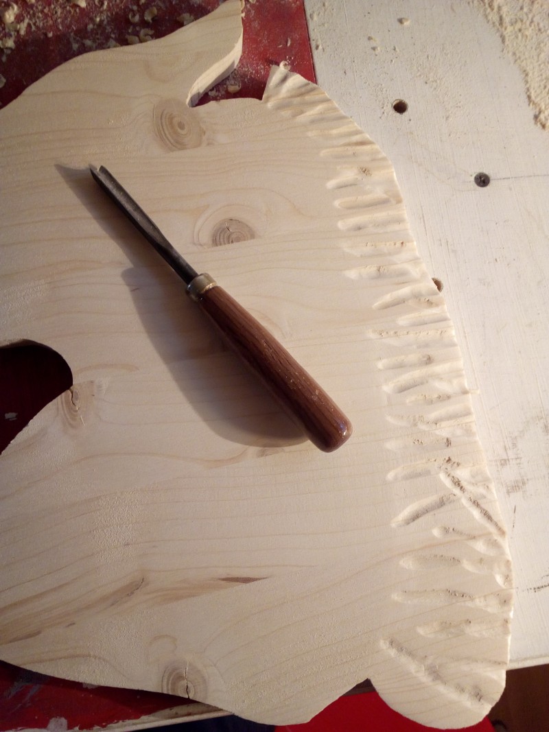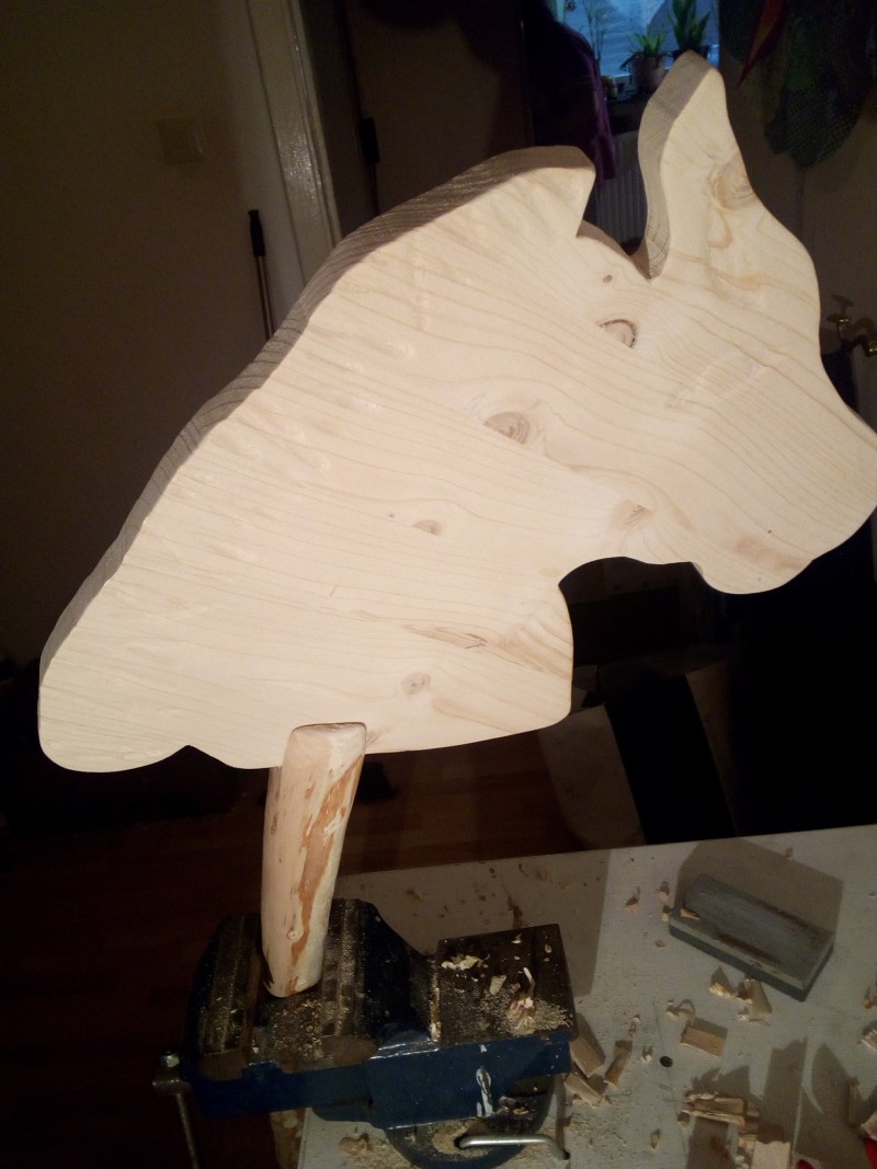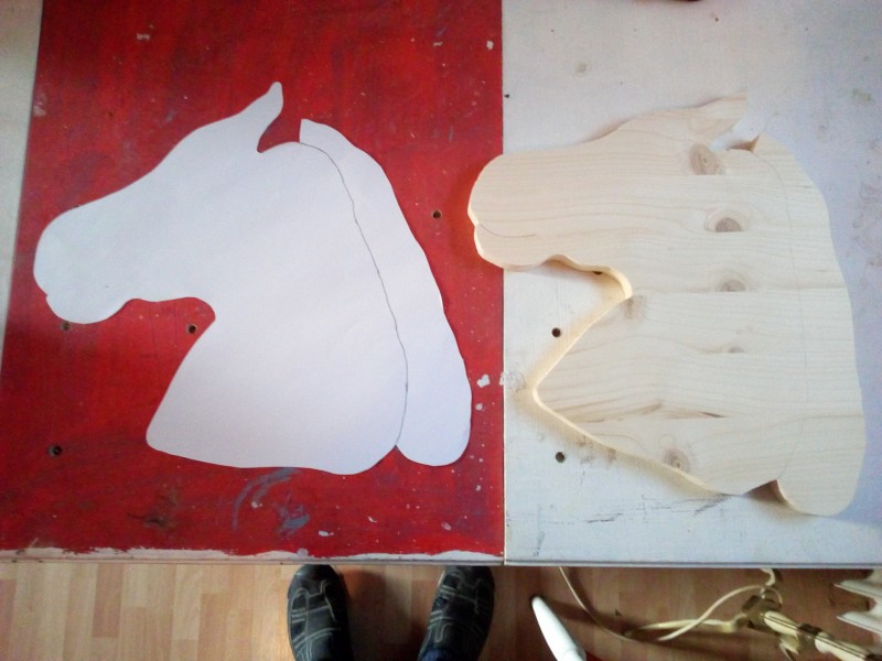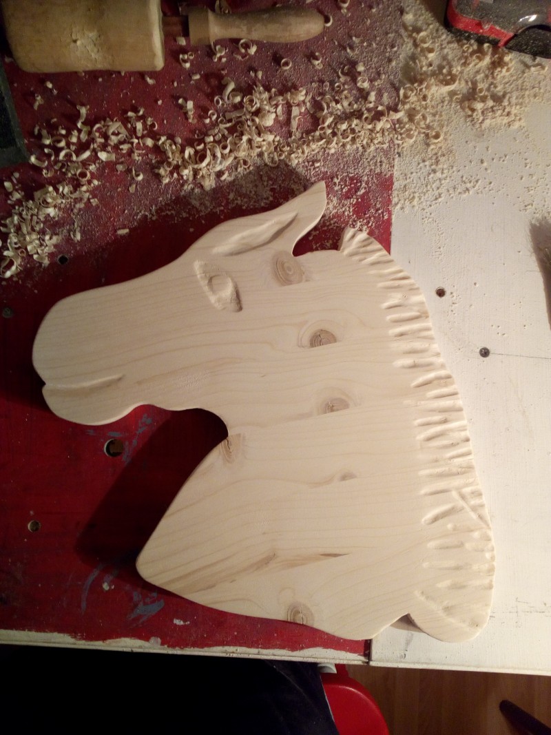 ich habe mich auch versucht und schon einmal den Pferdekopf herausgeschnitten, nachdem ich zuvor eine Papierschablone erstellt hatte und es auf ein Holzbrett übertragen hatte.