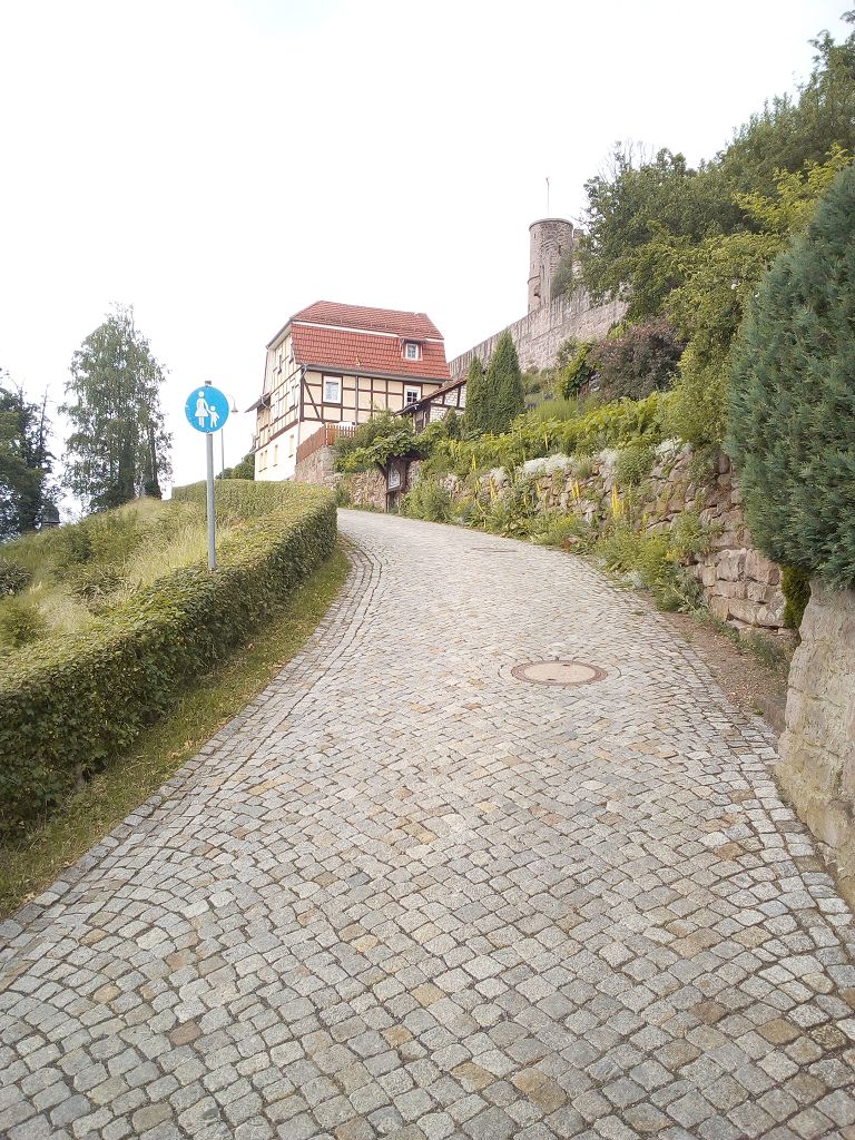 Nicht ganz deutlich zu sehen ist, dass der Weg steiler ist wie der erste Aufstieg zur Burg Nentershausen. Außerdem ist dort viel Schotter und man hat keine Möglichkeit, direkt vor die Tür zu fahren. Behindertengerecht ist das auch keineswegs. Der Weg vom Parkplatz gestaltet sich ebenso, erst steil hinab, dann zu diesem Weg steil wieder hoch.