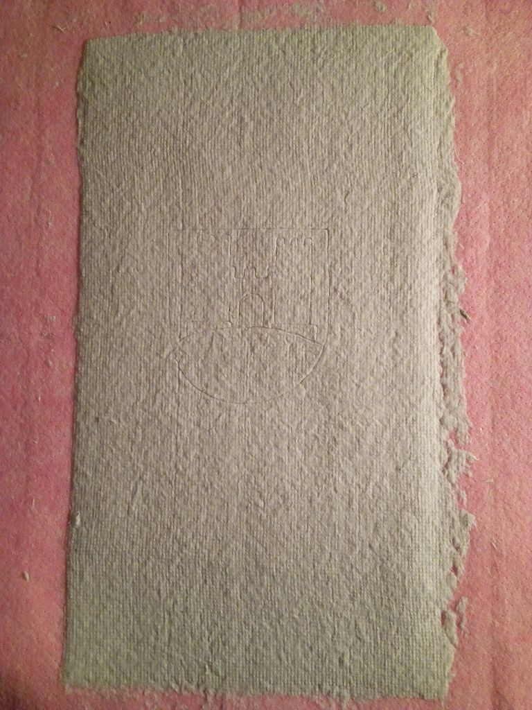 Hier habe ich das ganze noch einmal mittels einem anderem Tuch mehr gepresst und geglättet. Vermutlich aber auf kosten des Wasserzeichens. Aber das wird man in ein paar tagen sehen, wenn das Papier trocken ist.