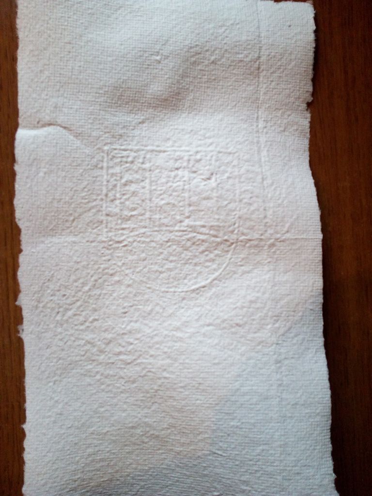 Etwas leicht verzogen und das Wasserzeichen ist deutlich sichtbar. Wobei auf der Vorderseite das so aussieht, als wenn jemand das Zeichen eingeritzt hätte ^^