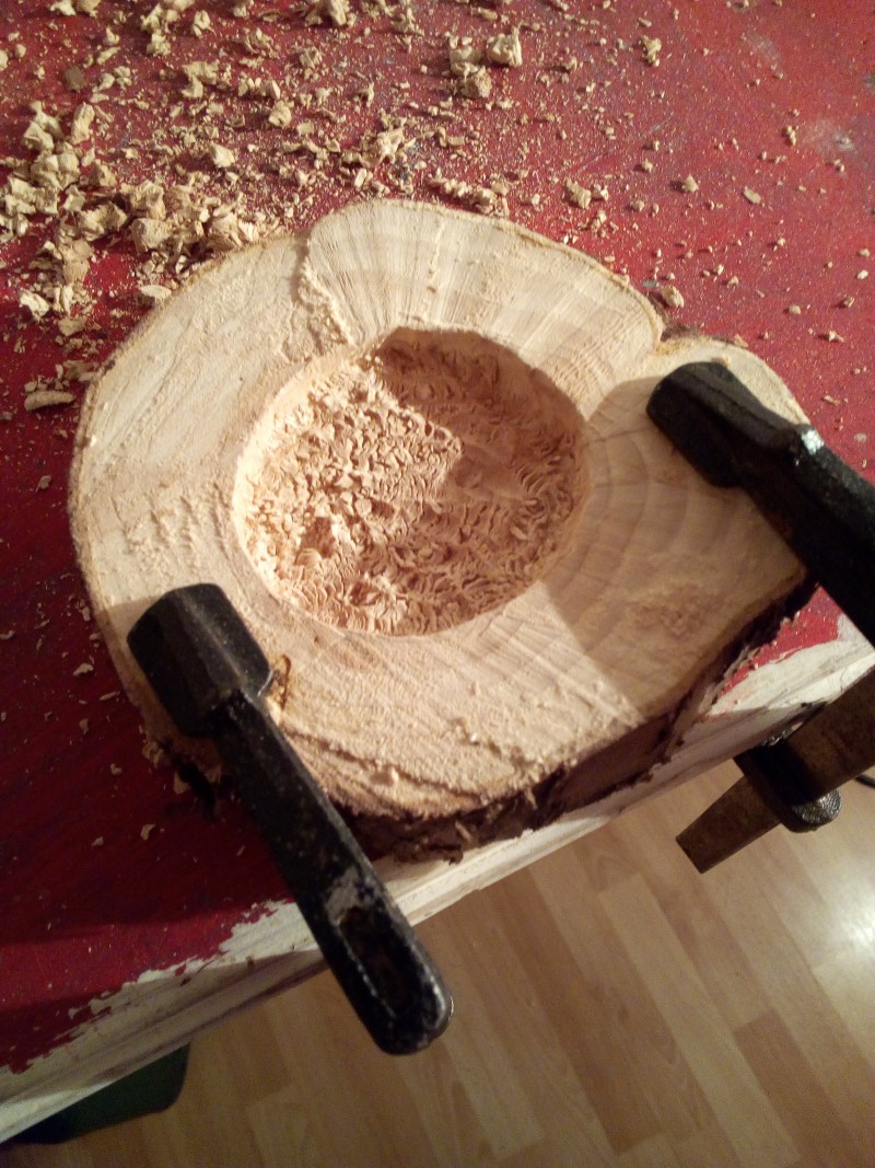 Das Holz ist in der Mitte ausgefranst. Mag aber vielleicht auch daran liegen, das dieses Stück Holz eventuell nicht ganz trocken ist und / oder mein Werkzeug doch nicht ganz so scharf ist wie gewollt. Aber noch ist die Vertiefung nicht fertig, so das ich noch etwas zu tun haben werde.