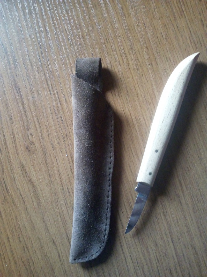 Damit ich mein Schnitzmesser verwenden kann und auch keinen verletzte, habe ich eine Messerscheide hergestellt. Idealerweise kann ich die auch am Gürtel tragen.