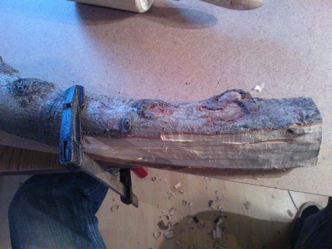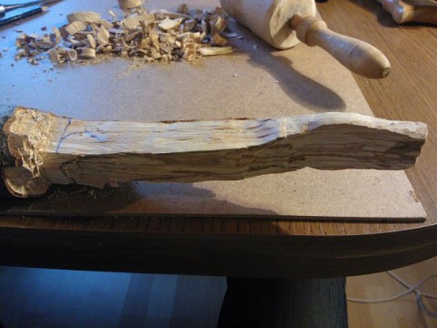 Hier kann man erkennen, das ich die Form grob aufgemalt habe, damit ich ansatzweise wusste, wie ich das Holz bearbeiten konnte. Man wird später sehen, das ich nicht exakt mich an meiner Vorlage halten konnte. Aber wie so oft mit Holz, nicht ich beherrsche das Holz, sondern das Material mich ^^