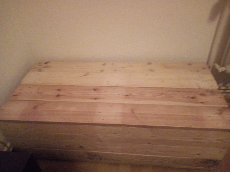 Unter der Truhe sind derzeit zwei Bretter, aber letztlich sollen da noch ordentliche Füße dran, so dass sie nicht direkt auf dem Boden liegt.