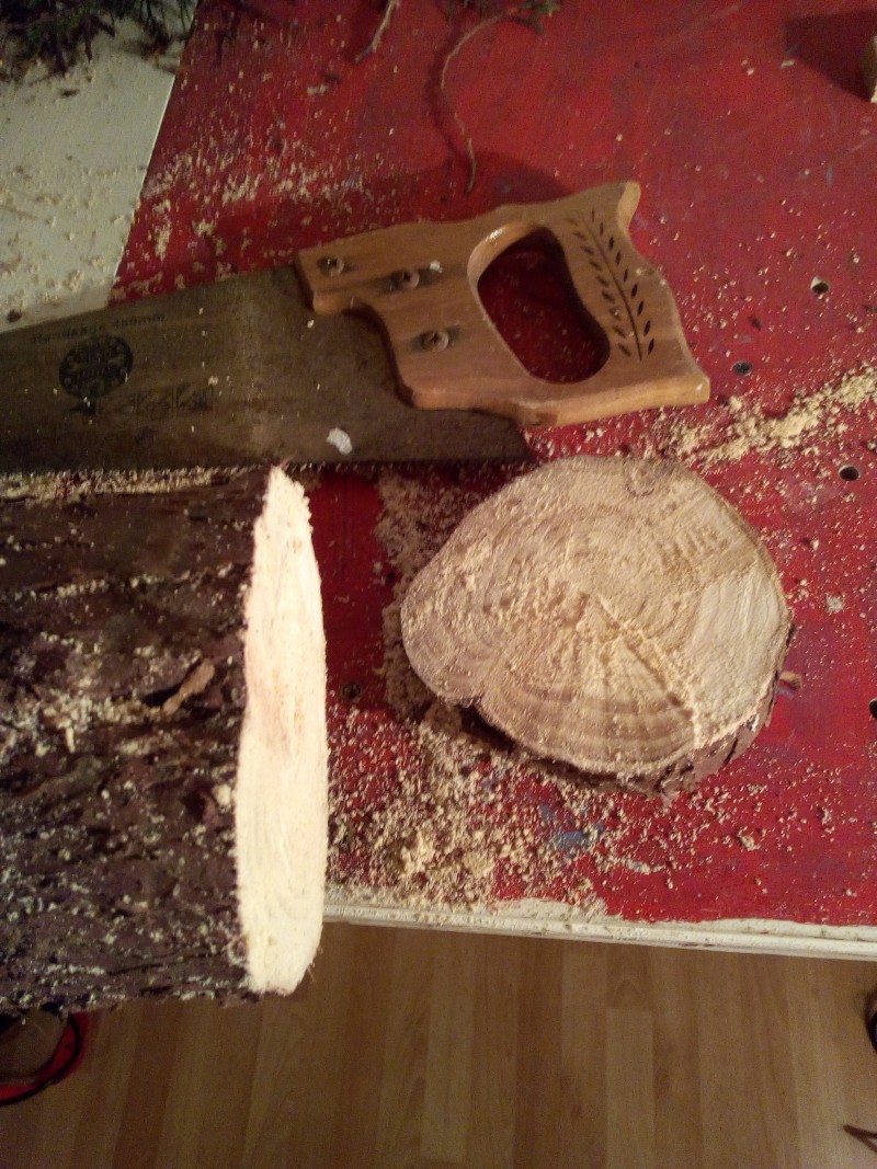 Hier zu sehen ist eine Scheibe, jene welche, die als Boden fungieren wird. Wie man sieht, wird die Laterne eher rundlich. So eine ähnliche Scheibe habe ich noch einmal abgeschnitten und zum trocknen weg gelegt. Dies wird einige Tage brauchen, bevor ich zum nächsten Schritt übergehen kann.